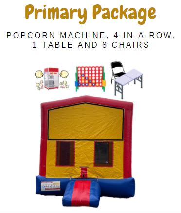 This package contains our Primary Colors bounce house, a popcorn machine including 50 servings, a giant version of the a childhood classic game (4-in-a-row), 1 8-foot table and 8 chairs.