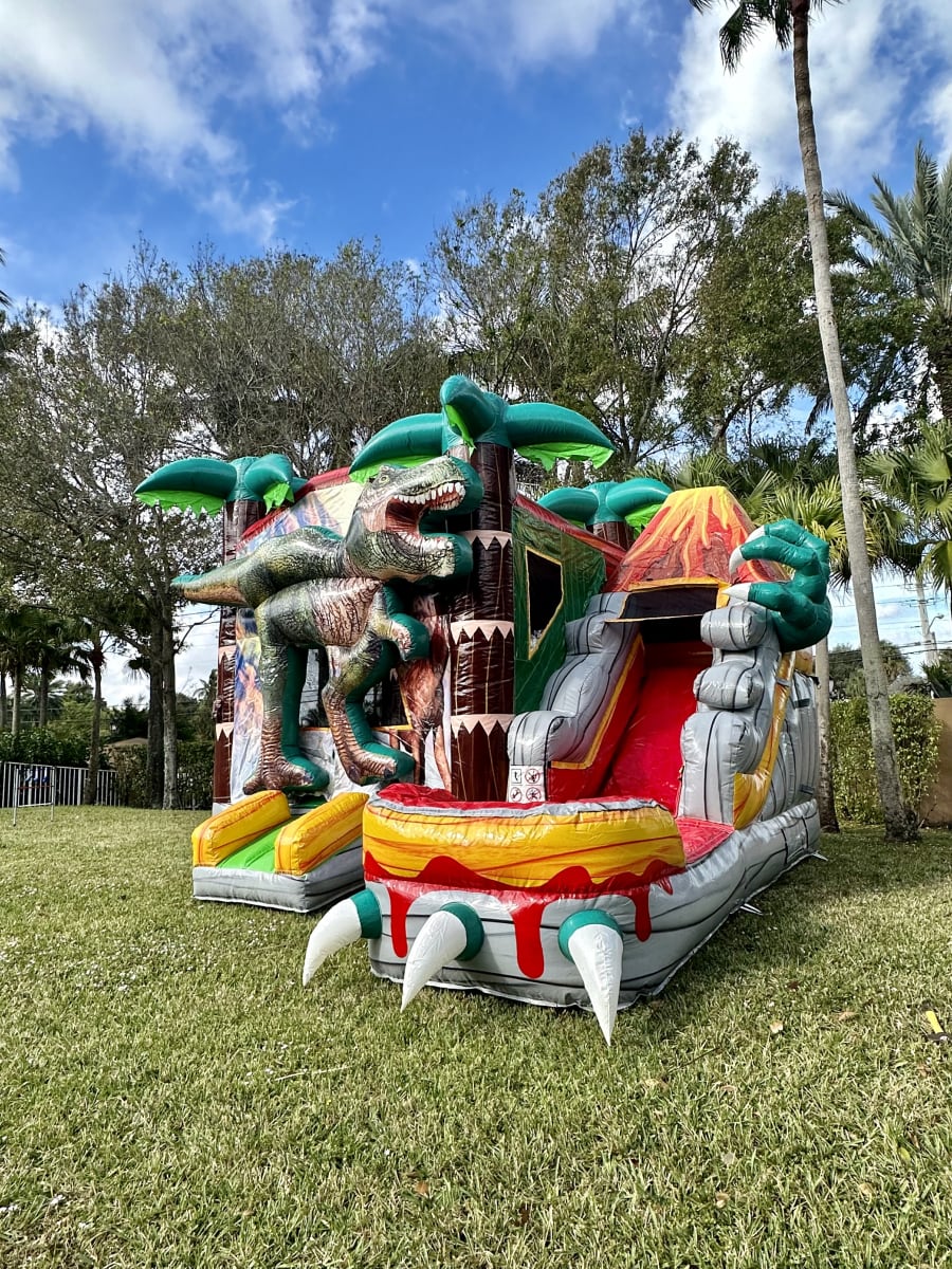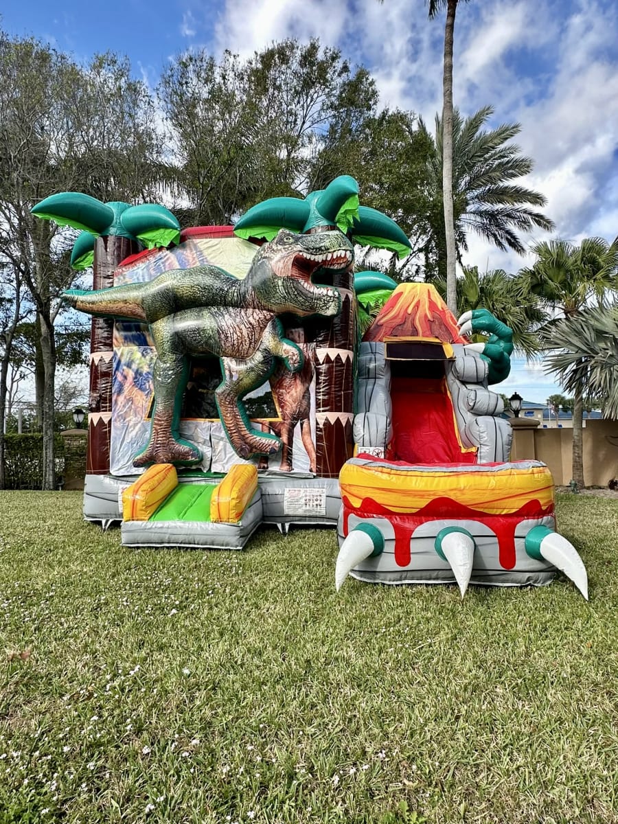 This combo is perfect or older children who love dinosaurs. For smaller children, see our Small Dino Combo. This unit measures 16.5’x16.5’x13’ and can be used wet or dry. Add one of our Concessions or Games for even more fun!