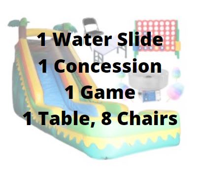 All of our Water Slide packages come with 1 water slide of your choice, 1 concession of your choice, 1 game of your choice, 1 8-foot table and 8 chairs. If you have any questions, text or call us at 561-678-5922.